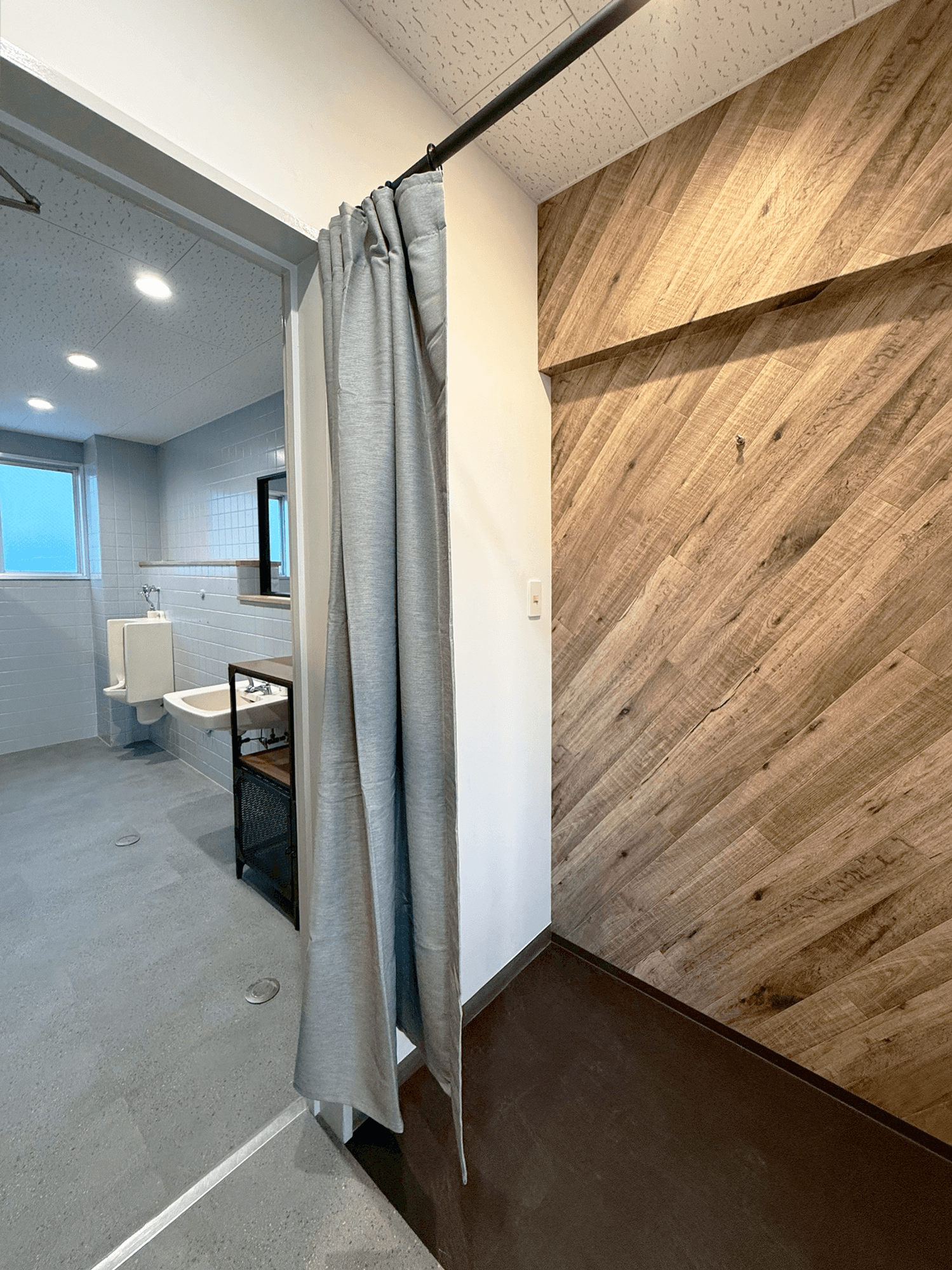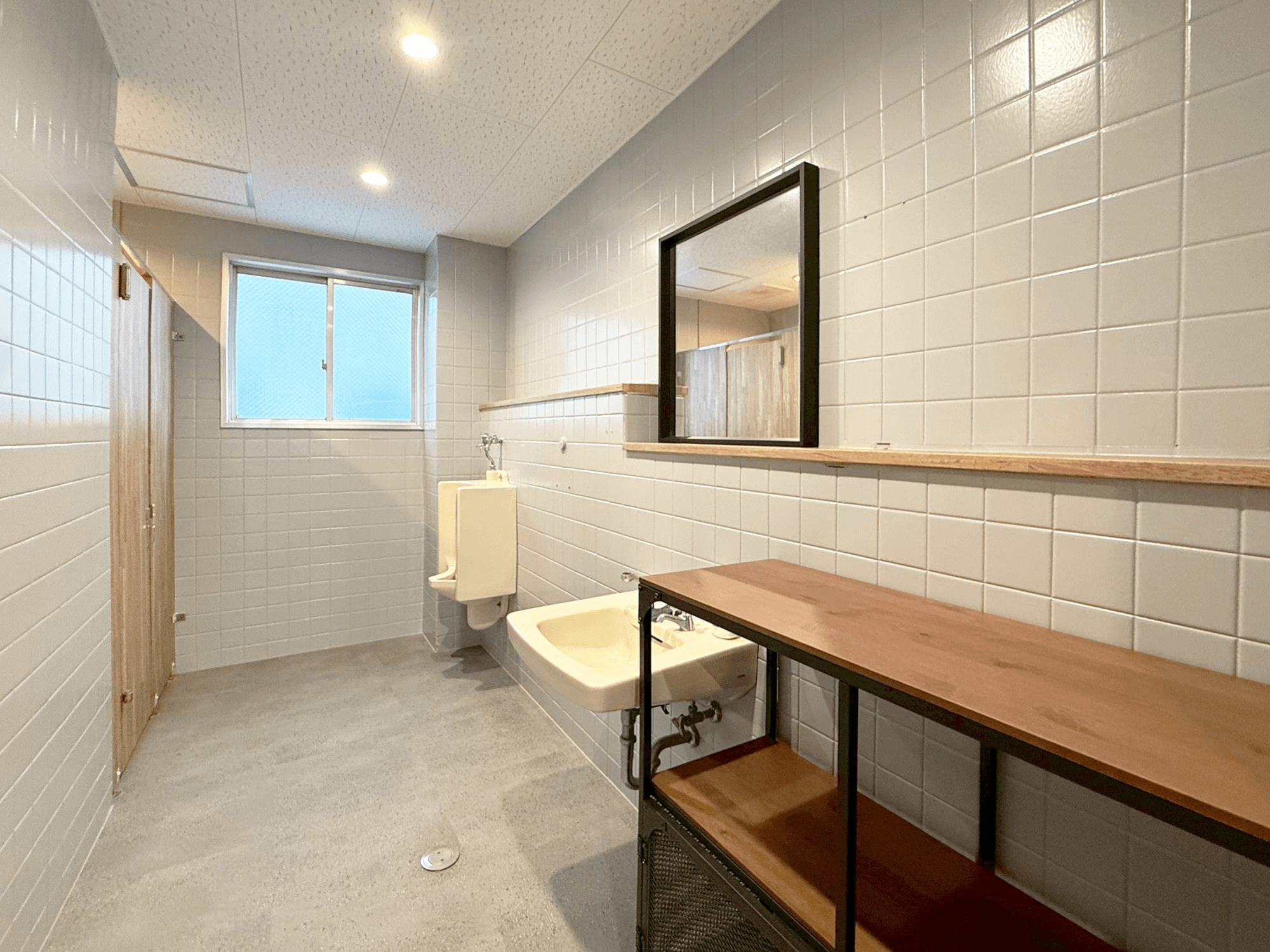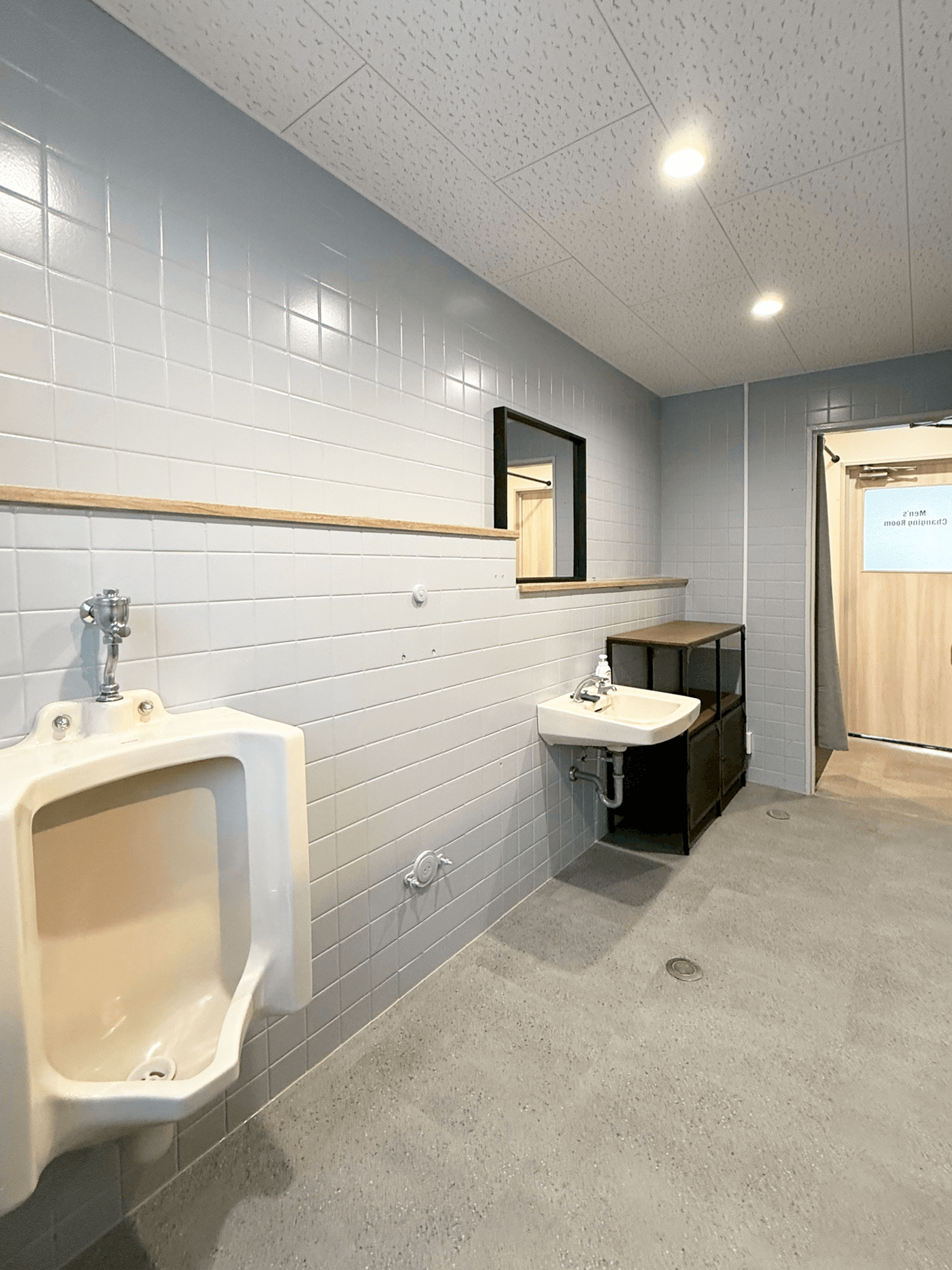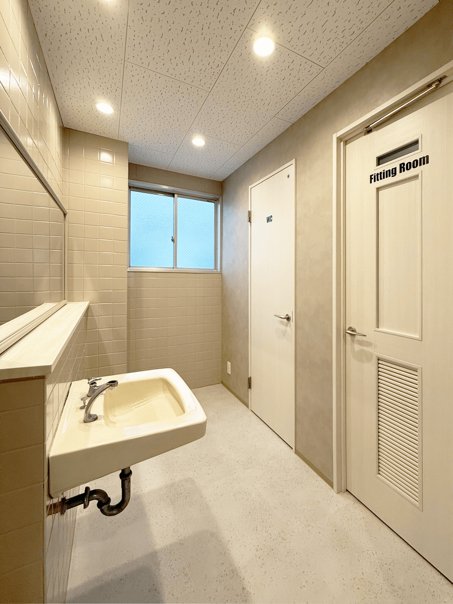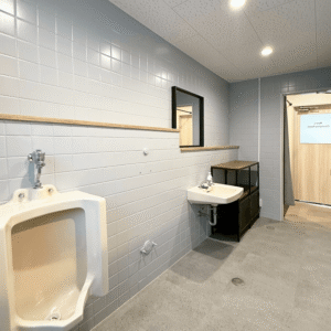 ベトレーニングジムの施工事例として、トイレ・パウダールーム・フィッティングルームを中心にデザイン・施工を行いました。男性用トイレは無骨さを意識したインダストリアルテイストで統一。一方、女性用トイレはベージュとホワイトを基調に、清潔感とやさしさを感じられるナチュラルな空間に仕上げています。パウダールームは照明や素材感にこだわり、トレーニング後もリラックスできる温かみのある雰囲気を演出しました。