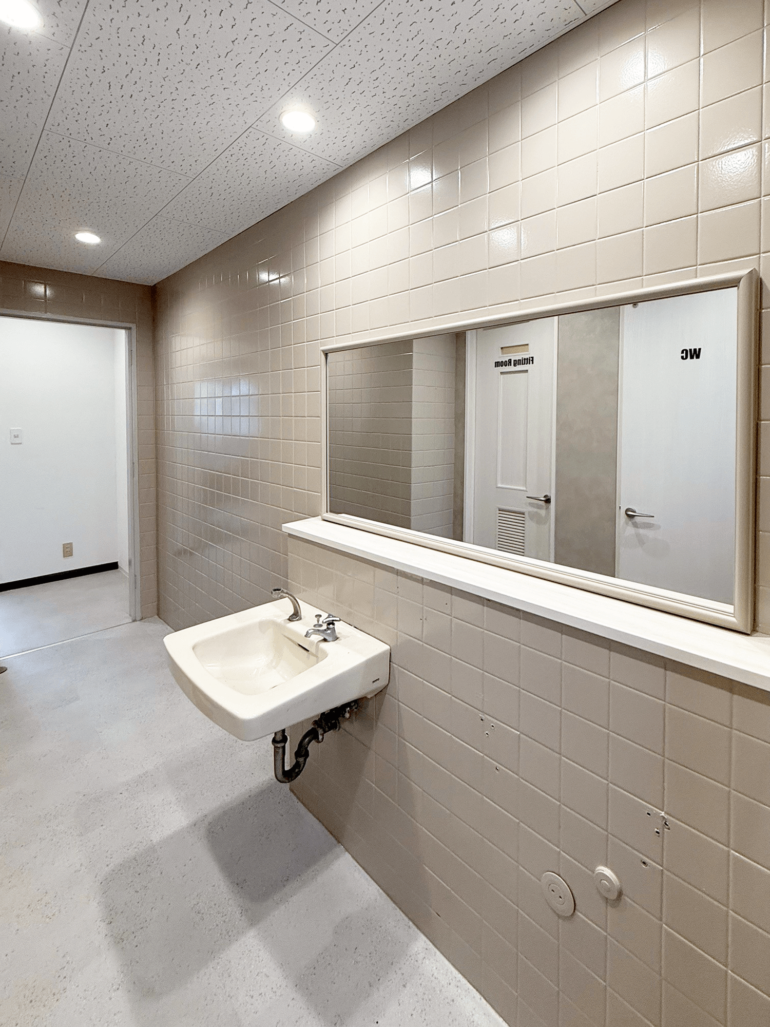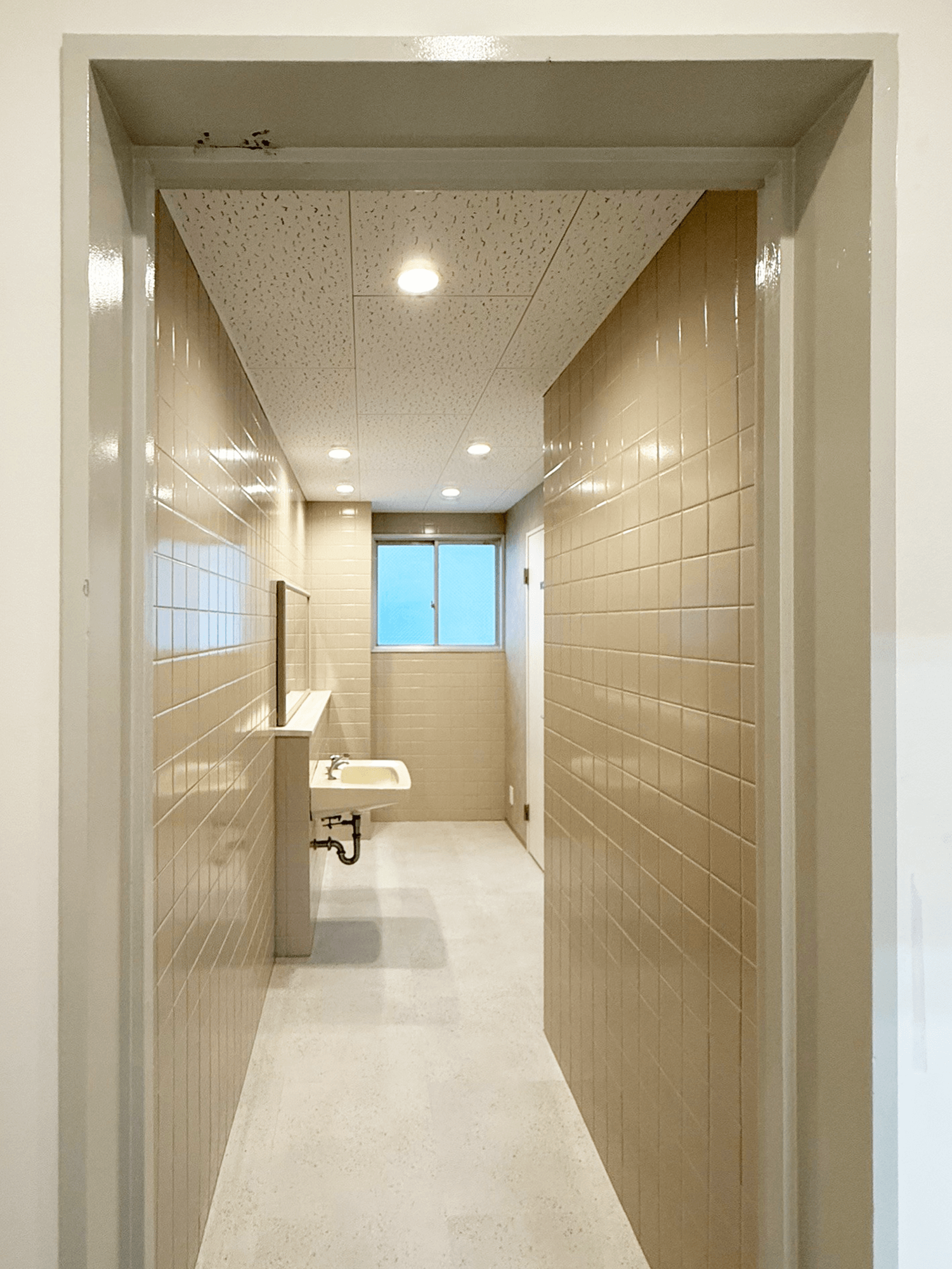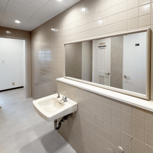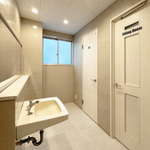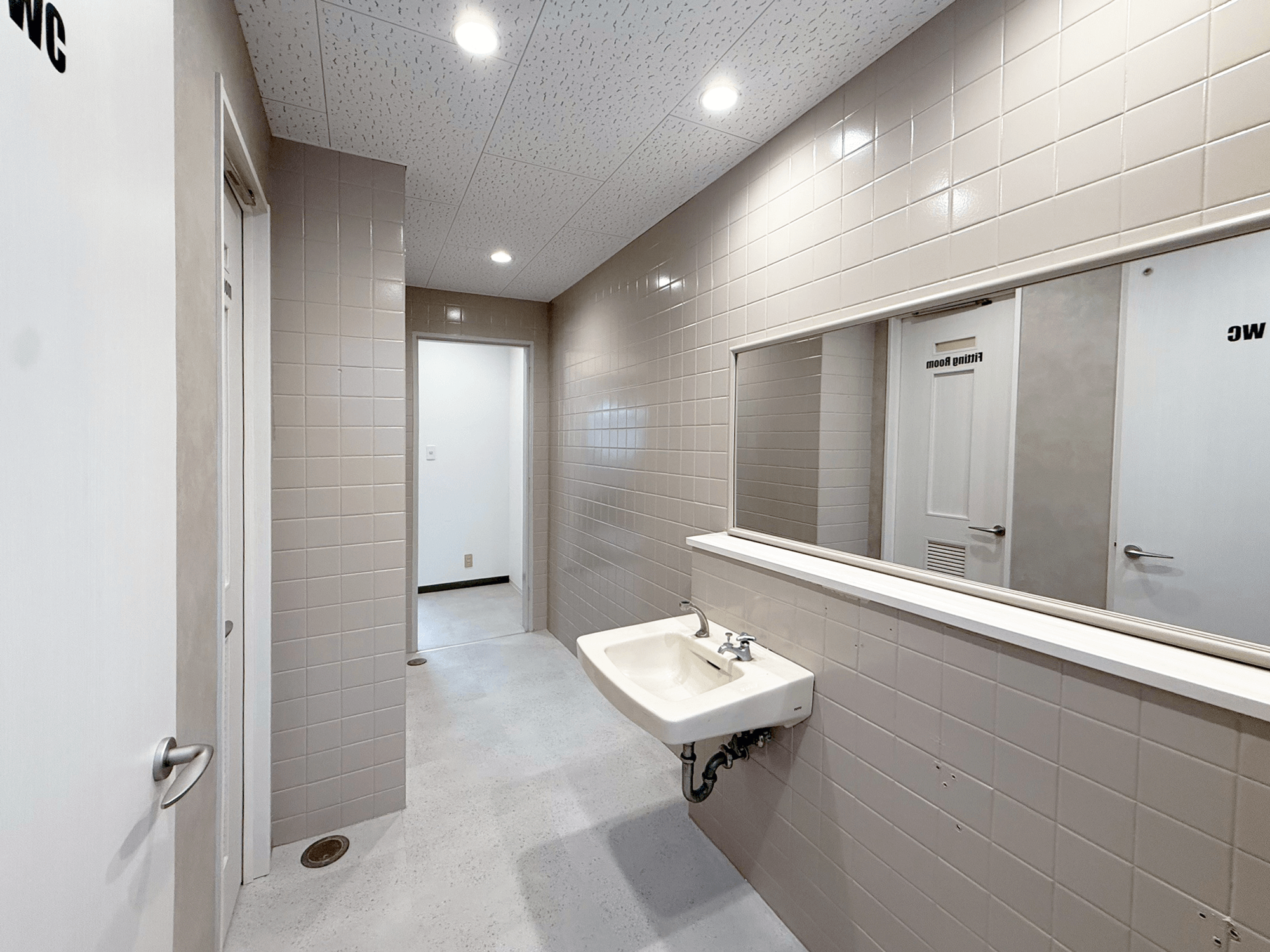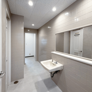 ベトレーニングジムの施工事例として、トイレ・パウダールーム・フィッティングルームを中心にデザイン・施工を行いました。男性用トイレは無骨さを意識したインダストリアルテイストで統一。一方、女性用トイレはベージュとホワイトを基調に、清潔感とやさしさを感じられるナチュラルな空間に仕上げています。パウダールームは照明や素材感にこだわり、トレーニング後もリラックスできる温かみのある雰囲気を演出しました。