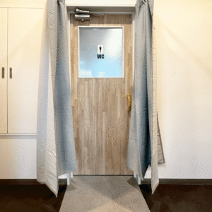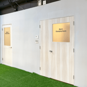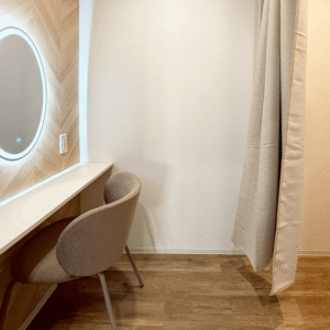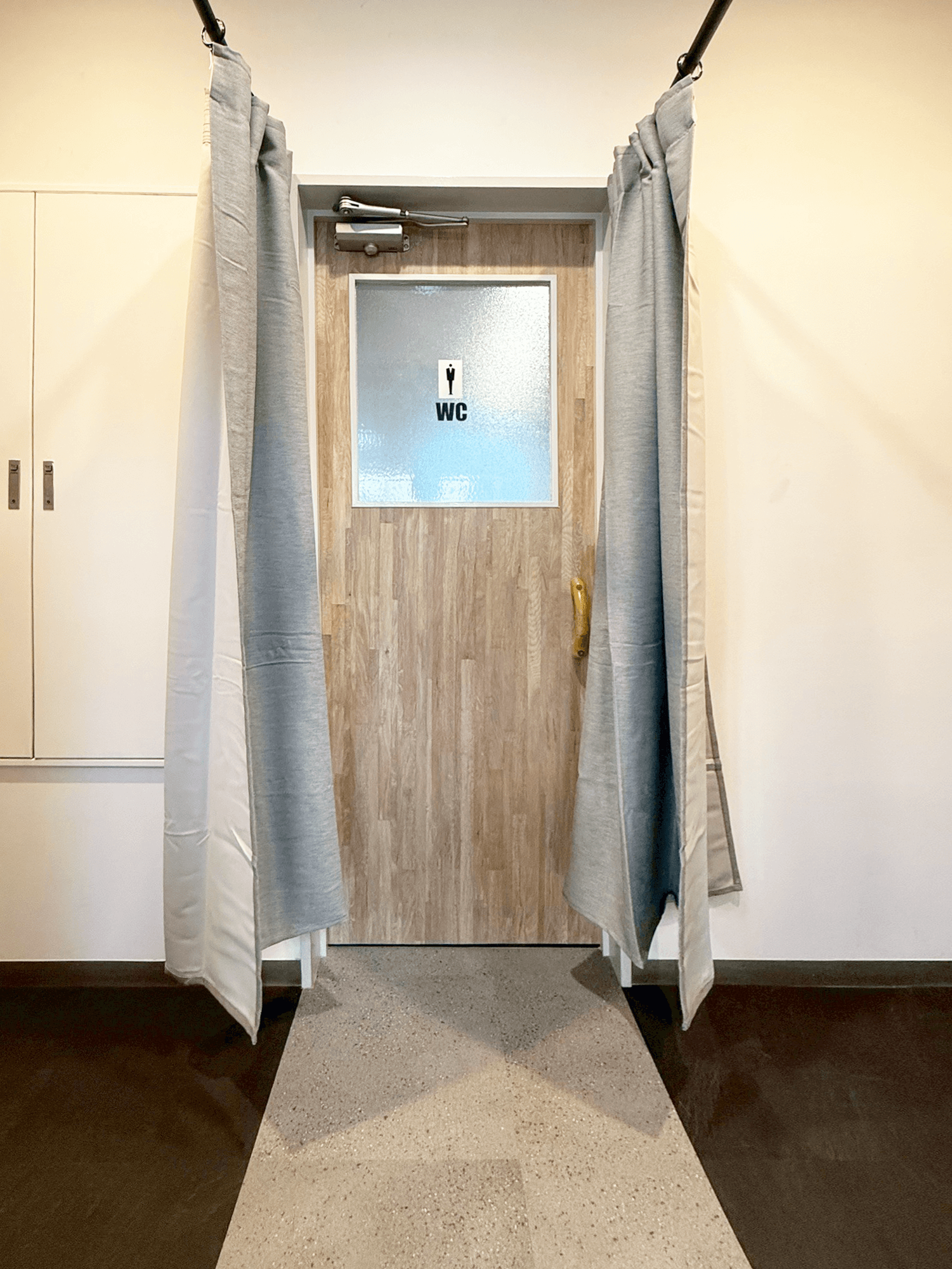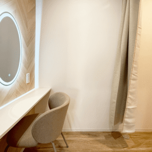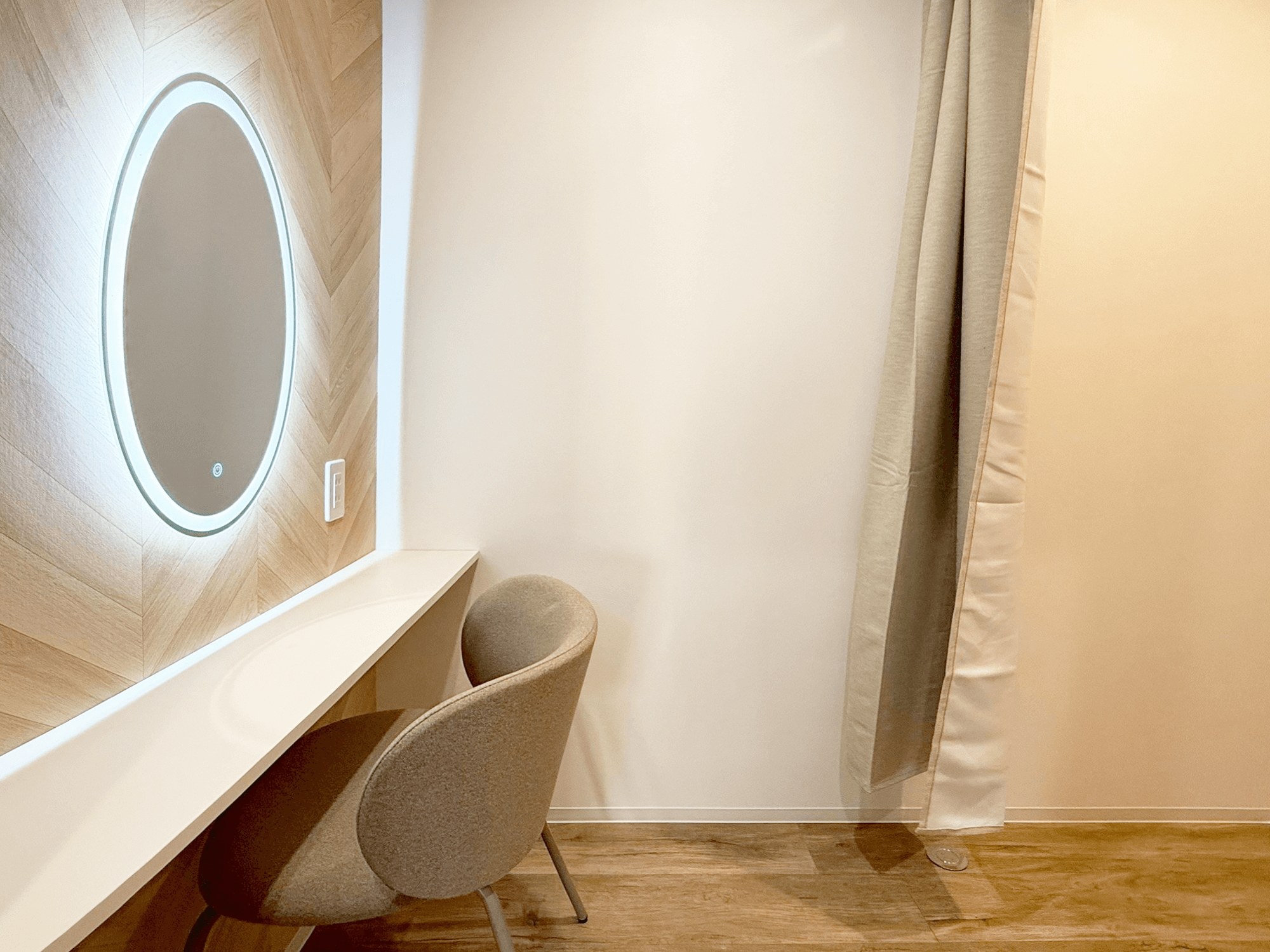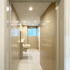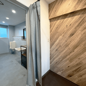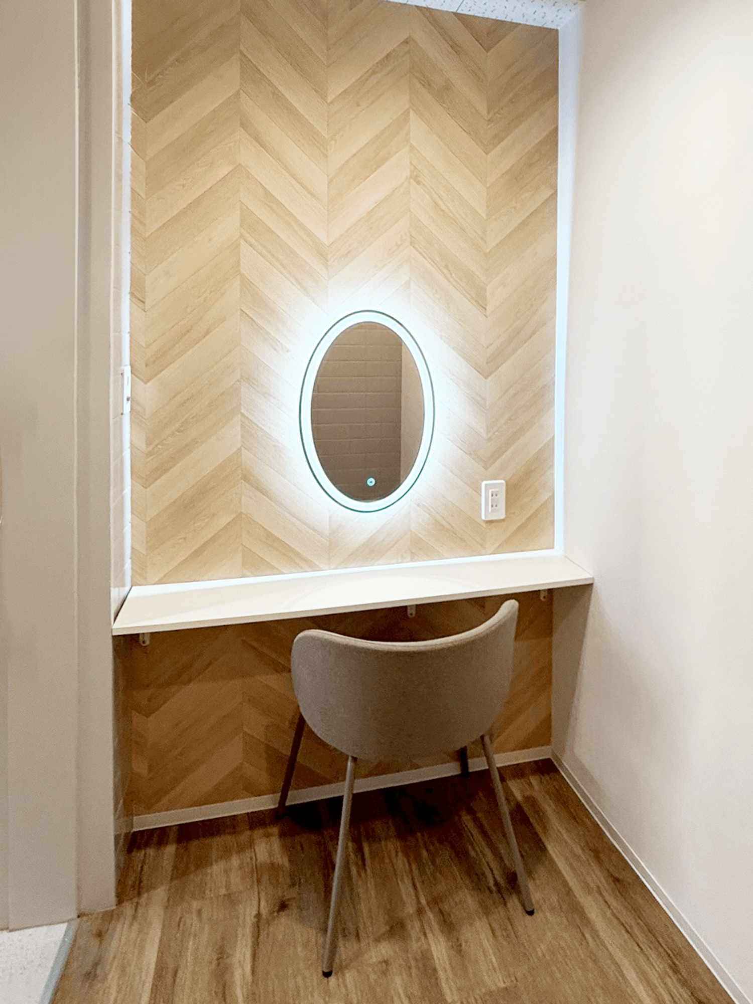 ベトレーニングジムの施工事例として、トイレ・パウダールーム・フィッティングルームを中心にデザイン・施工を行いました。男性用トイレは無骨さを意識したインダストリアルテイストで統一。一方、女性用トイレはベージュとホワイトを基調に、清潔感とやさしさを感じられるナチュラルな空間に仕上げています。パウダールームは照明や素材感にこだわり、トレーニング後もリラックスできる温かみのある雰囲気を演出しました。