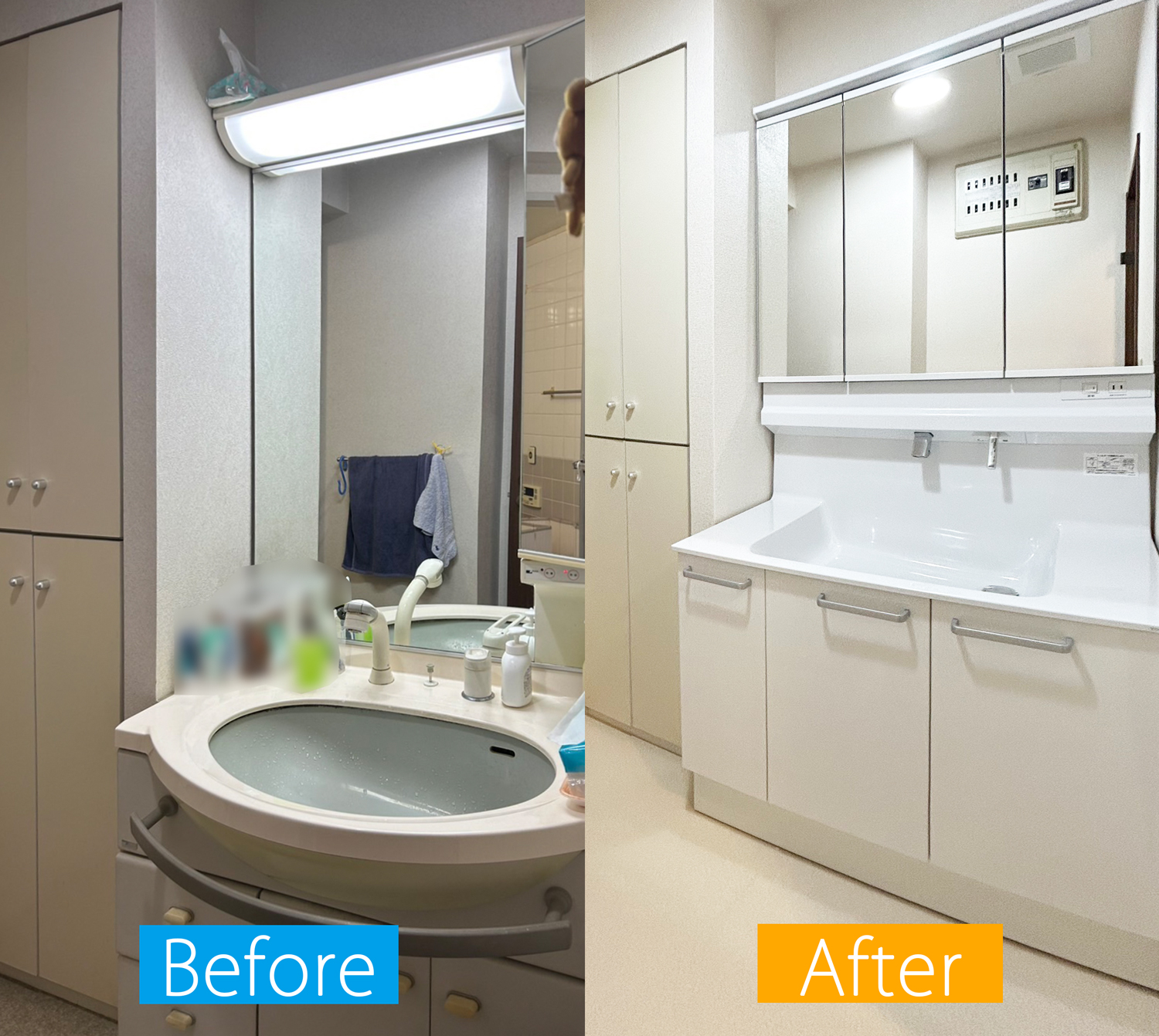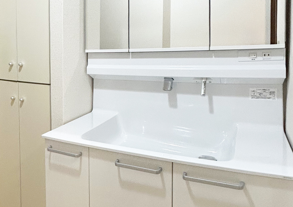 洗面とユニットバスのリフォームを行いました。洗面台は設備をまるごと交換し、白を基調とした清潔感のあるデザインに。蛇口には壁出し(ハイバック)タイプを採用しており、根元に水がたまりにくく、水垢や汚れが付きにくいため日々のお掃除も簡単です。ユニットバスにはTOTOの使いやすさと快適性を兼ね備えた「WYシリーズ」を採用し、機能性とデザイン性を両立した水まわり空間へと生まれ変わりました。